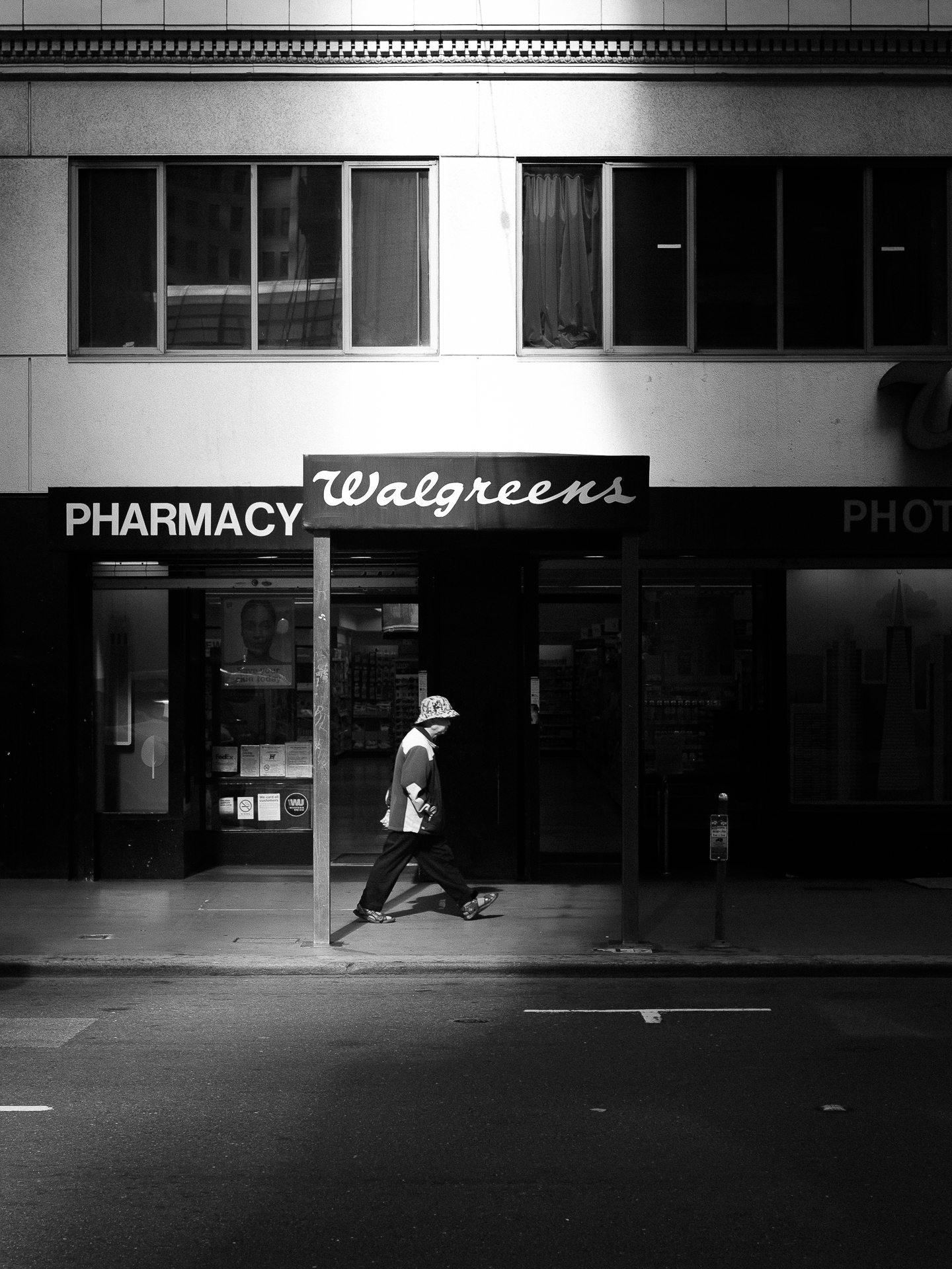 Shot#, “Walgreens Pharmacy”, stood out to me. I like the way the shadows and the strip of light frame the pedestrian.